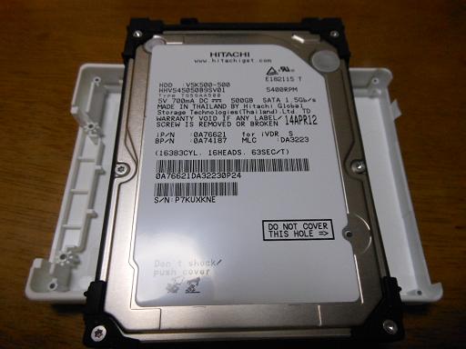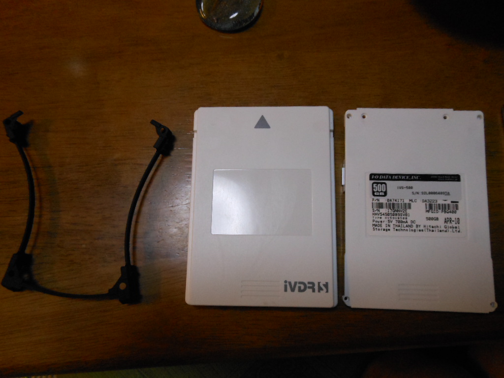 iVDR-S購入しました。 今回はmaxell製品。 念のため、購入した特殊ドライバで開封実績のあるI-O DATA製品にしたかったのだが、 手ごろな値段での購入ができず。 ネットでmaxell製品のiVDR-Sを写真(ネジ部分)を探したが、どこにもなかった(落ちている写真は表面ばかり)。 待っていたら先に進まないので、「えいやっ~」と清水の舞台から飛び降りる覚悟で購入(超大げさ)。 ネジを確認すると・・・ 同じだった( ´ー`)フゥー... 当然ながらHDDは日立製。 そういえばI-O DATAの製品も日立のHDDだったな。 Wooo内蔵のHDD、250GBです。 さあ、いよいよ交換。 留めネジをはアースを含めて3本。 交換も終了して、電源ON! ん?なんかメッセージが出たぞ。 HDDを認識できないとのこと。 フォーマットしていないからかなぁ・・・と思いつつ、 カセット側に差し込んでディスクの初期化を実施。 さあ、これでどうだ! と思いつつ電源ON! ん?また何かメッセージが・・・ HDDを認識できないだと~!Σ(゚Д゚)ガーン 当然ながらタイトルリストも表示されず(故障認識)、 Woooから初期化も当然できません。 メンテナンスモードの入口も閉ざされていて、これ以上は打つ手なしでございます。 購入したiVDR-Sは普通にカセットとして使用することになりました。 改造はくれぐれも、自己責任でお願いしますよ。