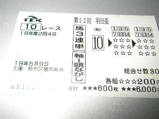 ひたちなか辺りでプラカードを持ったおじさんが道路脇に立っている。 オフトひたちなか駐車場はこっち 思わず釣られてしまいました(笑) 馬券を買うのも一昨年の名古屋競馬のJBC以来で1年半振り。 入場したら6Rのパドックをやってたけど、右も左も分からない状態で、なんとなく単勝オッズを参考に勝った馬券は・・・ (偽造防止のため一部画像修正してます) 大井6R 1着02番、2着05番、3着13番 うおおぉ、いきなり当たった! (3連複 02-05-13 6510円) 長居するつもりはないので、これで勝ちは確定(笑) 7Rをサクッと外して、前売りで9Rと明日の羽田盃を買って退場。 帰宅後9Rの結果を確認したらやっぱりハズレ。 羽田盃は、 結果報告は明日! PR